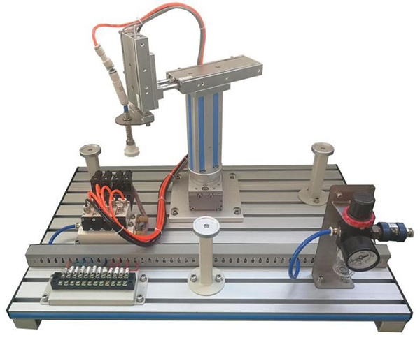 模型由回轉(zhuǎn)氣缸、雙軸氣缸、單軸氣缸、吸盤、真空發(fā)生器、電磁閥、節(jié)流閥、手滑閥、減壓閥、磁性開關(guān)、機(jī)械部件、工業(yè)鋁合金型材底板等組成,設(shè)有兩個(gè)抓取工位,可進(jìn)行工件取放控制練習(xí)?砷_展對(duì)氣動(dòng)機(jī)械手的操作及編程控制訓(xùn)練。配有空氣壓縮機(jī):靜音無(wú)油,工作電源AC220V±10% 50Hz,輸入功率0.68kW;公稱容積24L,理論流量:116L/min,額定輸出氣壓0.7MPa。