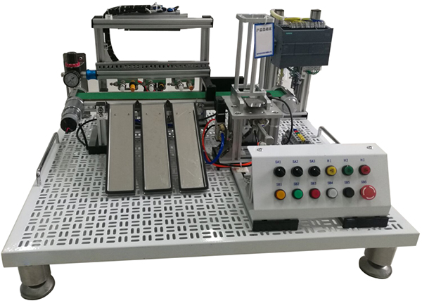 (4)按鈕模塊采用型材底座,安裝面板與桌面成45°夾角,包含急停按鈕1只,旋鈕開關(guān)3只,自鎖帶燈按鈕黃、綠、紅各1只,所有按鈕和旋鈕觸點(diǎn)均引至端子接線排上;自動(dòng)上料模塊主體安裝在工業(yè)型材上,結(jié)構(gòu)由鋁型材構(gòu)成,方型工件庫(kù)1件,物料推出機(jī)構(gòu)1件,光電傳感器,單缸氣缸1只,主要完成將工件庫(kù)中的工件依次推出;傳輸線模塊主要包含直流電機(jī)1臺(tái),滾動(dòng)軸承4只,滾輪2只,傳輸帶1條,主要完成將工件輸送到分揀區(qū);物料檢測(cè)及分揀模塊主要包含氣缸3個(gè),電感傳感器1只,電容傳感器1只;漫反射式光電傳感器1只,物料分揀槽3個(gè),完成物料的分揀工作。調(diào)壓閥主要安裝在型材底座支架上,含有手滑閥可控制氣路的通斷和壓力。輔助器件包含接線端子、物料、實(shí)訓(xùn)導(dǎo)線、氣管等,模型控制所需的I/O點(diǎn)數(shù)與所配主機(jī)I/O點(diǎn)數(shù)相配套。氣缸使用范圍0.1-1MPa,工作溫度-15-60℃,活塞帶磁環(huán)可完成檢測(cè);光電傳感器檢測(cè)范圍不小于1CM,輸出電流80-200MA,防護(hù)等級(jí)IP65,輸出方式NPN常開;傳感器檢測(cè)范圍不小于1CM,輸出電流80-200MA,防護(hù)等級(jí)IP65,輸出方式NPN常開。