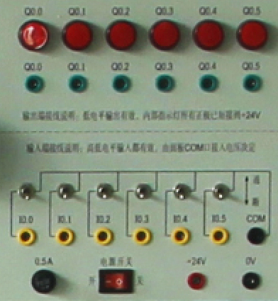 提供6路輸入、6路輸出等接口,輸入、輸出端電壓可自由切換0V和24V,輸出端由指示燈的亮滅來(lái)指示PLC輸出口的狀態(tài),面板印有清晰的說(shuō)明和端口絲印。通過(guò)基本指令練習(xí),讓學(xué)生掌握PLC輸入、輸出的外圍接線和工作原理。