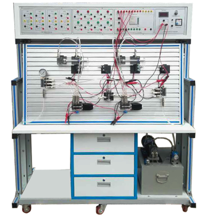 1、液壓PLC控制實驗臺主要由實訓(xùn)桌、實訓(xùn)臺、液壓元件和電器控制器件、可編程控制器(PLC)等組件組成。