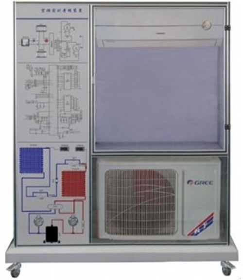 2.裝置直觀展示了變頻空調的系統(tǒng)結構和工作原理,便于教學演示講解及學生對課本知識的理解掌握。配置的交流電壓表、交流電流表、溫度表、真空壓力表以及相應的信號指示燈,使整個變頻空調系統(tǒng)的實時工作狀態(tài)一目了然;主面板中間印有電氣控制系統(tǒng)原理圖,并設有相應測試點;屏背面可觀察到整個制冷系統(tǒng)結構原理以及主要部件的實際物體,相應部件均有名稱標識;并設有視液鏡,可觀察制冷劑狀態(tài)