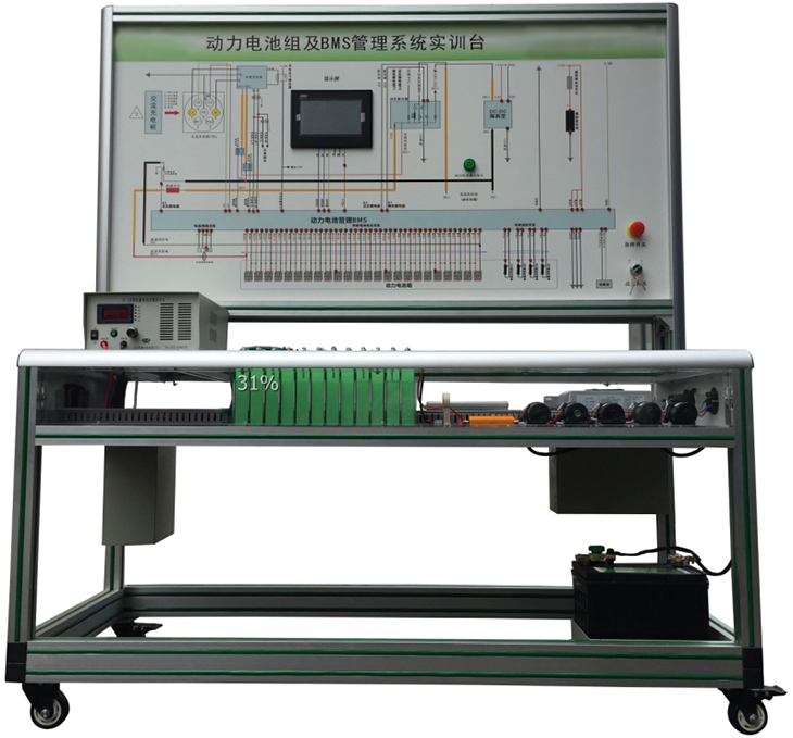 磷酸鐵鋰動力電池包與鐵制電池箱(單體電池3.2V 20AH,24串)、BMS鋰電管理一體機、動力電池包觸摸顯示屏、車載充電機、國標充電插口、國標充電槍、緊急斷電開關、霍爾電流傳感器、直流接觸器(包含充電繼電器、總正繼電器、總負繼電器、預充繼電器)、DC-DC轉(zhuǎn)換器(72V-12V30A)、輔助蓄電池(12V45AH)、放電控制繼電器與放電負載電阻、預充電阻器、可移動實訓臺(1500×700×1700mm 帶自鎖腳輪裝置,帶安裝檢測端子的原理面板,面板1448×940mm)、故障模擬與排除裝置、設備操作說明書。