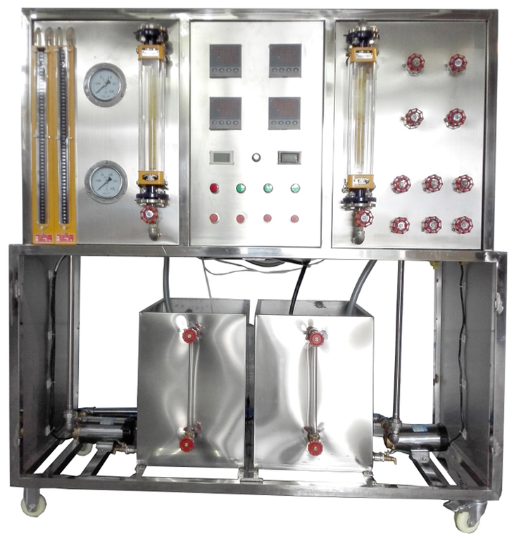 鋼原水箱及加熱水箱,順、逆流調節(jié)閥門組,阻力測試壓力表及U型差壓計,加熱功率由固體調壓模塊無級調節(jié),萬能信號輸入巡檢儀顯示溫度,電流表,電壓表,不銹鋼臺架及控制屏等。