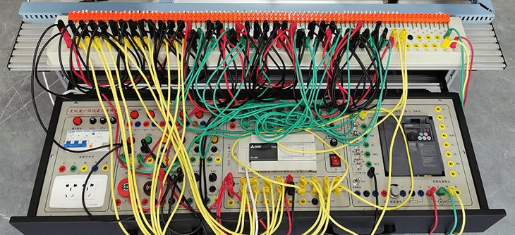 3.開放性:該實驗裝置PLC模塊I/O端子、變頻器的接線端子、各常用模塊與PLC的連接端子、傳感器、按鈕開關、指示燈元件等端子全部開放,均采用護套插座導線連接,可進行電氣線路控制、電氣線路設計等內(nèi)容實訓。