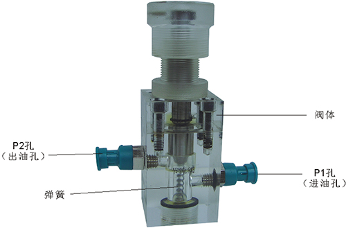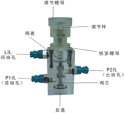 2、溢流閥結(jié)構(gòu)上參考了國產(chǎn)P-63B型低壓直動式溢流閥,其閥體閥蓋、鎖緊螺母、調(diào)節(jié)螺母、螺塞等采用了進口透明有機玻璃材料精制而成,閥芯、調(diào)節(jié)桿采用了45#中碳鋼材料。并配合彈簧,油接頭,密封圈等標準件裝配而成,通過它可明確地觀察到閥芯、彈簧、油孔等結(jié)構(gòu)及其運行過程,具有形象逼真,性能可靠等優(yōu)點。它即可作為教學(xué)模型,也可以作為液壓實驗元件進行實驗演示。