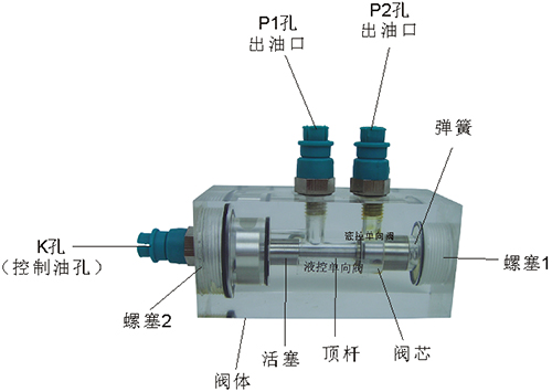 2、液控單向閥結(jié)構(gòu)上參考了國產(chǎn)IY-25B型液壓單向閥,其閥體、螺塞等采用了進口透明有機玻璃材料精制而成,閥芯、頂桿采用了45#中碳鋼材料,并配合彈簧,油接頭,密封圈等標準件裝配而成,通過它可明確地觀察到活塞、彈簧、油孔等結(jié)構(gòu)及其運行過程,具有形象逼真,性能可靠等優(yōu)點。它即可作為教學(xué)模型,也可以作為液壓實驗元件進行實驗演示。