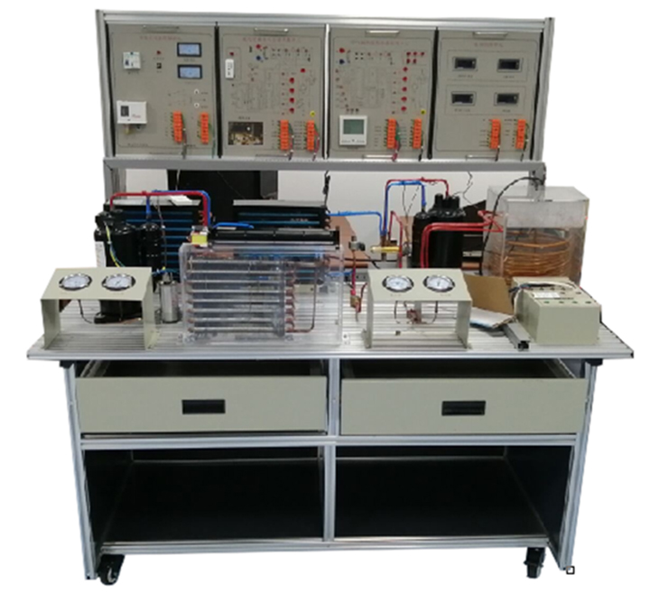 制冷與制熱系統(tǒng)技能實訓(xùn)裝置該產(chǎn)品包含了制冷、熱力學(xué)、傳熱學(xué)和電氣控制等技術(shù),主要由熱泵型家用空調(diào)系統(tǒng)和空氣源熱泵系統(tǒng)兩大部分組成。在鋁合金導(dǎo)軌式實訓(xùn)臺上安裝冷凝器、蒸發(fā)器、節(jié)流裝置、壓縮機(jī)、控制電路等,構(gòu)成一個典型的制冷裝置,電氣控制采用掛箱式,能進(jìn)行制冷系統(tǒng)的組裝、調(diào)試、運(yùn)行,真實呈現(xiàn)制冷裝置的工作過程,通過對制冷系統(tǒng)的安裝、保壓、檢漏、抽真空、電氣連線、加氟、系統(tǒng)調(diào)試及工況調(diào)整等,完成對學(xué)生的現(xiàn)代制冷與空調(diào)系統(tǒng)設(shè)備安裝、調(diào)試和維修技能訓(xùn)練。