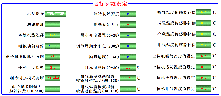 11)、顯示界面上29 路參數(shù)控制參數(shù)設(shè)置/查詢:控制器內(nèi)所有與控制相關(guān)的溫度參數(shù)、時間參數(shù)、控制參數(shù)、等29個參數(shù)都可以調(diào)整,以適應(yīng)制冷/熱泵/冷庫/水機(jī)等設(shè)備。