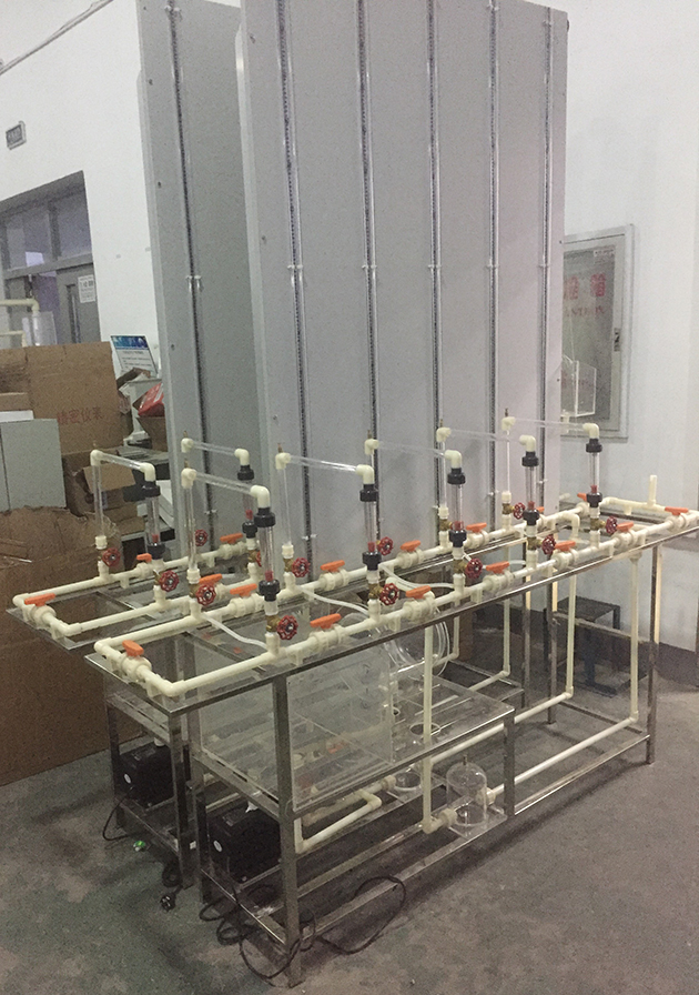 不銹鋼實(shí)驗(yàn)臺(tái)架、下半部由管道、閥門(mén)、流量計(jì)、穩(wěn)壓罐、鍋爐、水泵組成,用來(lái)模擬由5個(gè)用戶(hù)組成的熱水網(wǎng)路。上半部有高位水箱和安裝在一塊垂直木版上的12根玻璃管,玻璃管的頂端與大氣相通,玻璃管下端用膠管與網(wǎng)路分支點(diǎn)相接,用來(lái)測(cè)量熱網(wǎng)用戶(hù)連接點(diǎn)處的供水干管與回水干管的測(cè)壓管水頭(水壓曲線(xiàn)高度)。每組用戶(hù)的兩支玻璃管間附有標(biāo)尺以便直觀的讀出各點(diǎn)壓力。