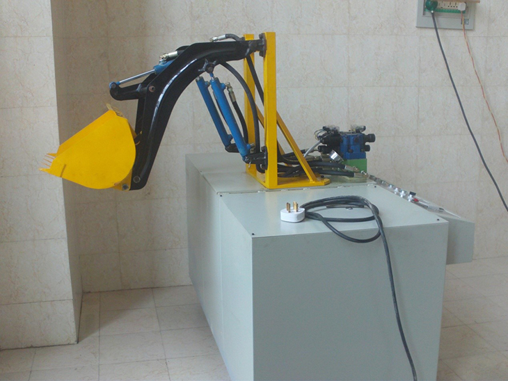 3、裝載機(jī)械按實物比例縮小的全金屬結(jié)構(gòu),實驗時啟動液壓系統(tǒng)根據(jù)實驗要求模以操作機(jī)械進(jìn)行工作。