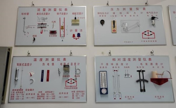 2、本示教板由液體玻璃管溫度計、雙金屬片溫度計、熱能電敏溫度計、銅電阻溫度計和 多種熱電偶等實物或模型組成,并在每類儀表下面畫有材質和使用適用溫度范圍的表格和工作原理圖