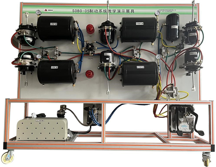 1.臺(tái)架上具有的全新天錦EQ1120GA原車(chē)零部件有空氣壓縮機(jī)總成、空氣干燥劑、前橋儲(chǔ)氣筒、后橋儲(chǔ)氣筒、手制動(dòng)儲(chǔ)氣筒、再生儲(chǔ)氣筒、輔助儲(chǔ)氣筒、四回路保護(hù)閥、制動(dòng)腳閥、駐車(chē)閥、ABS電磁閥、繼動(dòng)閥、制動(dòng)管路、氣壓表若干個(gè)。