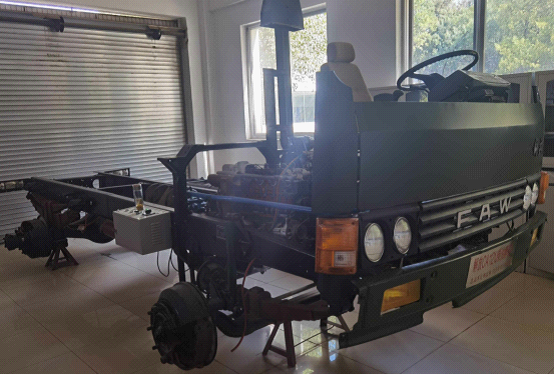 該設(shè)備采用東風(fēng)天錦EQ1120GA2型運兵車底盤各系統(tǒng)(拆卸車外殼)為基礎(chǔ),充分展示汽車底盤各系統(tǒng)的組成結(jié)構(gòu)。包括汽車前后懸掛系、轉(zhuǎn)向系、傳動系、手動變速器及掛檔機(jī)構(gòu)、制動系等系統(tǒng)、安裝腳輪的可移動式臺架等組成。