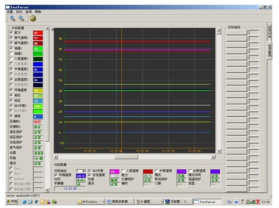 中央空調(diào)機由于工程復雜,設備分散,有的已經(jīng)裝修在開花板上測試程序,一但出現(xiàn)了故障,工程量相當大,為了能夠快速準確地測出故障是由主機機組還是室內(nèi)機的故障的,每個生產(chǎn)廠家根據(jù)生產(chǎn)的和維修的需要而開發(fā)了中央空調(diào)測試程序?蓽y試壓縮機的運轉(zhuǎn)頻率,傳感器的各種數(shù)據(jù),電子膨脹閥的工作步數(shù)等幾十種中央空調(diào)的工作數(shù)據(jù)和狀態(tài),軟件可實現(xiàn)對內(nèi)機的控制,,可以對1-64臺內(nèi)機的狀態(tài)進行設定。是高校提供了好的研究的學習設備。