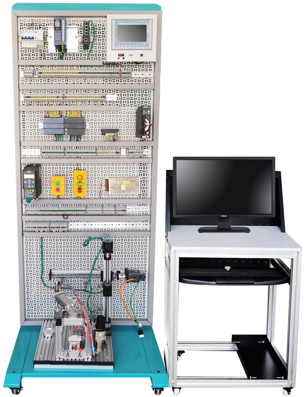 3)電氣控制系統(tǒng)∶ 開放式工業(yè)機架結(jié)構(gòu),含成套器件;面板采用網(wǎng)孔板形式,4 只萬向輪(2 只帶剎車)?蓪 PLC、電源、變頻器、觸摸屏等安放在該平臺上,配有空氣開關(guān)、接線端子、電纜線、輔料,接地可靠,設(shè)有漏電等保護裝置,安全性符合相關(guān)的國標標準,保護學生在實訓過程中的安全性。采用工業(yè)規(guī)范制作,所有接線有標號,便于實訓和日常維護。