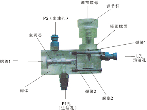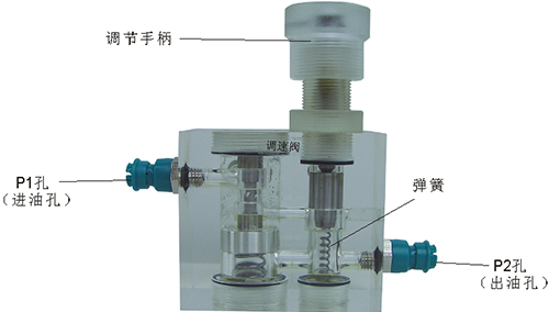 2、溢流閥結(jié)構(gòu)上參考了國產(chǎn)P-63B型低壓直動式溢流閥,其閥體閥蓋、鎖緊螺母、調(diào)節(jié)螺母、螺塞等采用了進口透明有機玻璃材料精制而成,閥芯、調(diào)節(jié)桿采用了45#中碳鋼材料。并配合彈簧,油接頭,密封圈等標準件裝配而成,通過它可明確地觀察到閥芯、彈簧、油孔等結(jié)構(gòu)及其運行過程,具有形象逼真,性能可靠等優(yōu)點。它即可作為教學(xué)模型,也可以作為液壓實驗元件進行實驗演示。