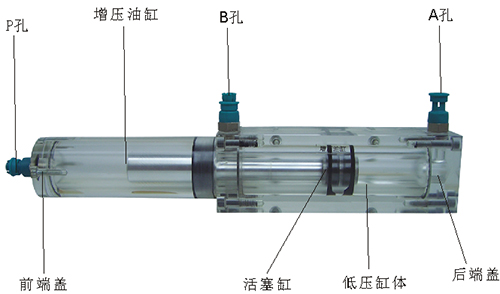 2、增壓油缸的前端、后端蓋、低壓缸體、增壓缸體等均采用了進口透明有機玻璃材料精制而成,透明清晰,活塞桿采用了合金鋁材料,并配合油接頭,密封圈,內(nèi)六角螺絲等標準件裝配而成,通過它可明確地觀察到活塞桿,油封,油孔等結(jié)構(gòu)及其運行過程,具有形象逼真,性能可靠等優(yōu)點,它既可作為教學(xué)模型,也可以液壓實驗元件進行實驗演示。