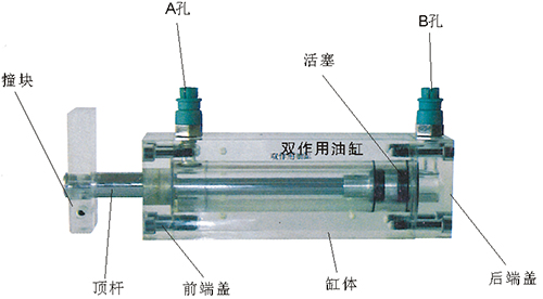 2、雙作用油缸的缸體,端蓋,行程撞塊,撞塊支承等均采用了進口透明有機玻璃材料。頂桿采用了45#中碳鋼,并配合油接頭,密封圈,內(nèi)六角螺絲等標準件精制而成。能通過它明確地觀察活塞、頂桿、油封、油孔等結(jié)構(gòu)及其運行過程。