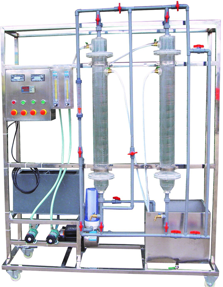 離子交換實驗裝置由陰、陽交換柱、耐酸堿泵、離子交換樹脂、液體轉子流量計、原水箱、淡水槽、濃水槽、再生液投配裝置、防腐工程塑料管道閥門、電導率儀、不銹鋼框架、控制屏等組成。